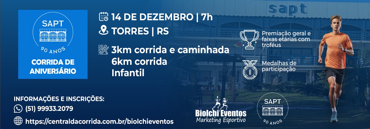 A corrida de aniversário da SAPT, celebrando seus 90 anos, está marcada para 14 de dezembro de 2025, no município de Torres, RS. O evento oferece opções de 3km (corrida e caminhada) e 6km (corrida infantil). A cidade de Torres está localizada no litoral norte do Rio Grande do Sul, com um clima subtropical úmido, com temperaturas médias anuais em torno de 20°C e chuvas regulares. Em dezembro, a região está em período de verão, com possibilidade de aumento da população devido ao turismo.